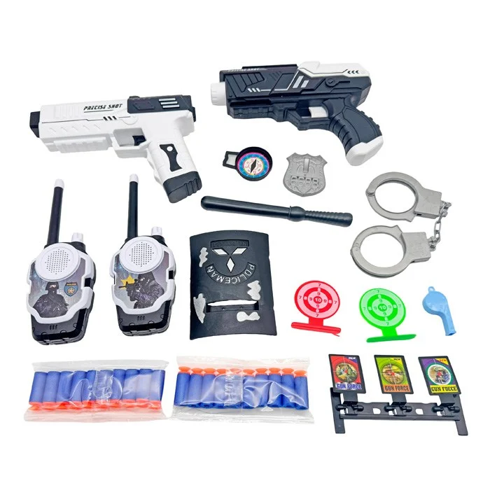 O kit acompanha 15 peças, incluindo pistolas lançadoras de dardos com espuma, algemas, distintivos, alvos e diversos acessórios que deixam a brincadeira ainda mais realista. Os dardos são feitos de espuma macia, proporcionando mais segurança durante o uso.